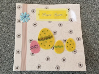 I had some sticky felt egg shapes which I put on the middle of the card but felt that something was missing; my young friend suggested drawing patterns on them to make them look more like Easter eggs which I did.